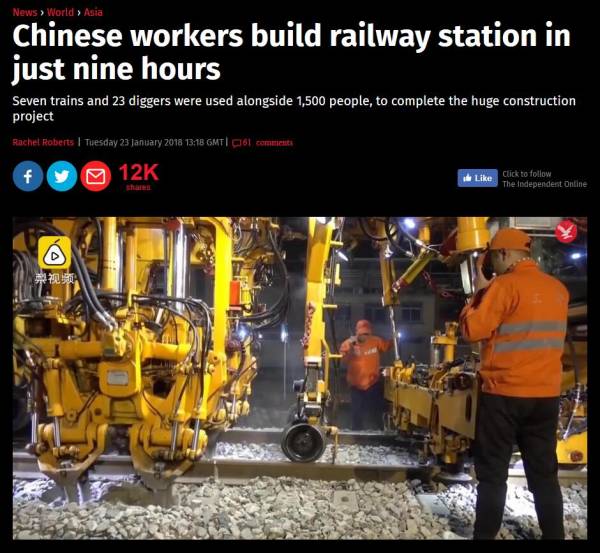 報道以《中國工人建火車站只要9個小時》為標題,并稱中國的先進基建工程讓人“嘆為觀止”。