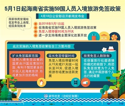 “擴大免簽國范圍;延長免簽停留時間;放寬免簽人數(shù)限制?!?月18日,公安部在京召開新聞發(fā)布會,國家移民管理局在發(fā)布會上通報:經(jīng)國務(wù)院批準(zhǔn),自2018年5月1日起,在海南省實施59國人員入境旅游免簽政策,進一步支持海南全面深化改革開放。