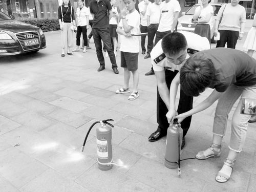 員工在滅火演練前熟悉滅火器的用法