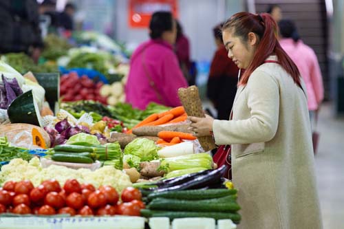 4月11日,南京市民在一家農(nóng)貿(mào)市場購買蔬菜。新華社發(fā)(蘇陽攝)