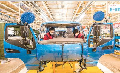 2月11日,在山東省青州市一家汽車制造企業(yè)生產(chǎn)車間內(nèi),工人正在組裝生產(chǎn)輕型卡車。 王繼林?jǐn)z(人民視覺)