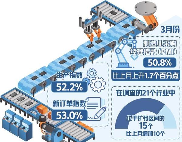 “3月份PMI指數(shù)大幅回升,且重回榮枯線之上,既有季節(jié)性因素影響,也表明經(jīng)濟回升向好態(tài)勢進一步明確?!眹鴦?wù)院發(fā)展研究中心研究員張立群表示。