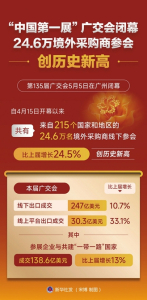 第135屆廣交會(huì)5日在廣州閉幕。自4月15日開(kāi)幕以來(lái),共有來(lái)自215個(gè)國(guó)家和地區(qū)的24.6萬(wàn)名境外采購(gòu)商線下參會(huì),比上屆增長(zhǎng)24.5%,創(chuàng)歷史新高。本屆廣交會(huì)線下出口成交247億美元,線上平臺(tái)出口成交30.3億美元,分別比上屆增長(zhǎng)10.7%和33.1%。