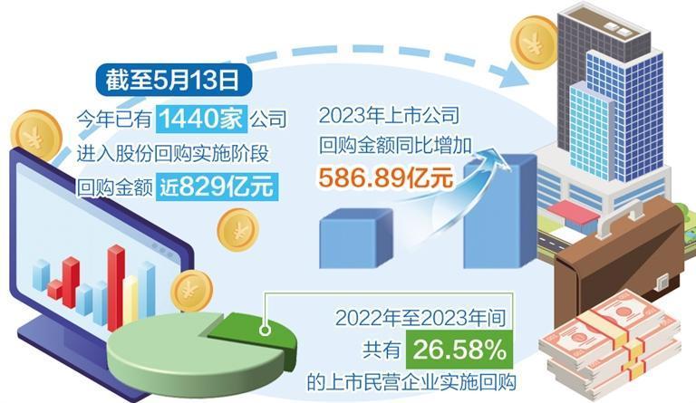 A股上市公司股份回購熱持續(xù)升溫。Wind數(shù)據(jù)顯示,截至5月13日,今年已有1440家公司進入股份回購實施階段,合計回購金額近829億元,遠超去年同期的247億元。中國上市公司協(xié)會數(shù)據(jù)顯示,2023年上市公司回購金額同比增加586.89億元,增長108.82%。