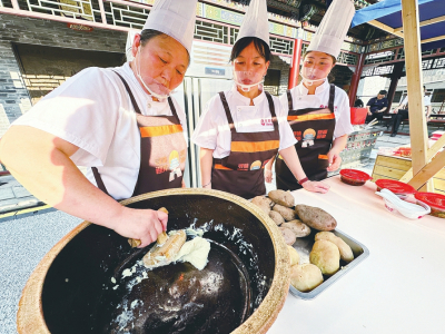 9月3日傍晚,太原鐘樓街,來自嵐縣的廚師正在制作當(dāng)?shù)靥厣朗惩炼埂澳酶狻?。近日,隨著“跟著悟空游山西”的持續(xù)升溫,太原鐘樓街吸引了眾多游客,品嘗富有山西特色的美食成為人們打卡鐘樓街的主要內(nèi)容。