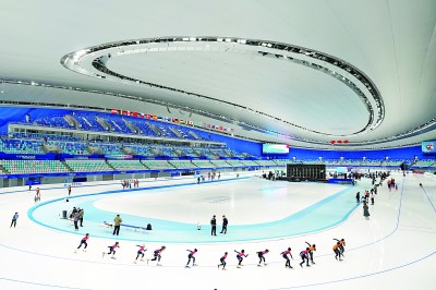 在北京國(guó)家速滑館,參加速度滑冰的小選手們?cè)谫惽盁嵘怼P氯A社發(fā)