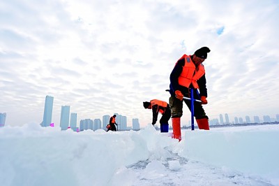 工人在黑龍江哈爾濱冰雪大世界采冰現(xiàn)場(chǎng)作業(yè)。新華社發(fā)