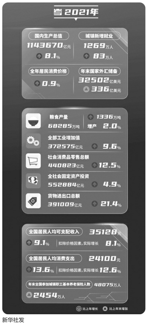 國家統(tǒng)計局2月28日發(fā)布的2021年國民經(jīng)濟和社會發(fā)展統(tǒng)計公報顯示,2021年,面對百年變局和世紀(jì)疫情,全國上下共同努力,我國經(jīng)濟發(fā)展和疫情防控保持全球領(lǐng)先地位,構(gòu)建新發(fā)展格局邁出新步伐,高質(zhì)量發(fā)展取得新成效,實現(xiàn)了“十四五”良好開局。
