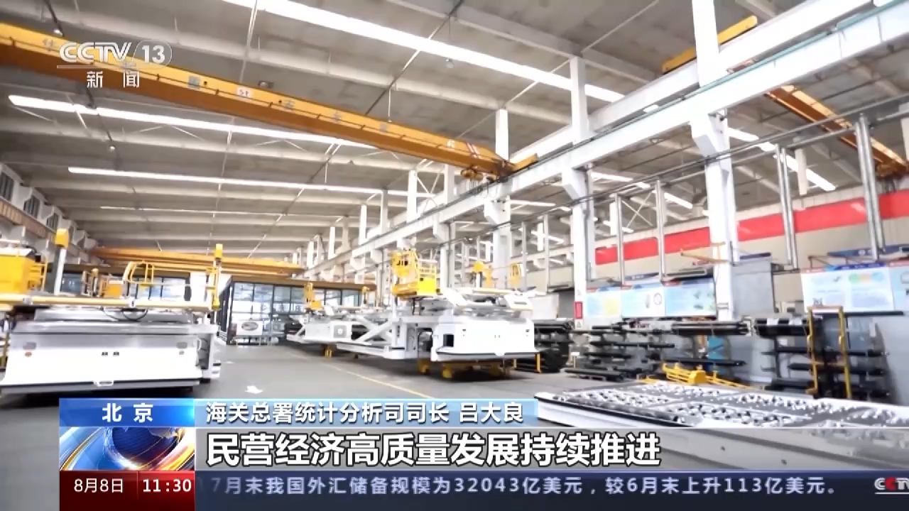 海關總署統(tǒng)計分析司司長 呂大良:今年以來,民營企業(yè)進出口增速高于整體,占比進一步提升,參與外貿(mào)的民營企業(yè)數(shù)量不斷增加,前7個月達到47.8萬家,同比多了3.6萬家。近期,關于促進民營經(jīng)濟發(fā)展壯大的意見發(fā)布實施,民營經(jīng)濟高質量發(fā)展持續(xù)推進,民營企業(yè)的國際競爭力將進一步提高。