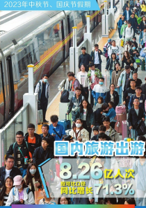 經(jīng)文化和旅游部數(shù)據(jù)中心測算,2023年中秋節(jié)、國慶節(jié)假期,全國國內(nèi)旅游出游人數(shù)8.26億人次,同比增長71.3%,按可比口徑較2019年增長4.1%;實現(xiàn)國內(nèi)旅游收入7534.3億元,同比增長129.5%,按可比口徑較2019年增長1.5%。
