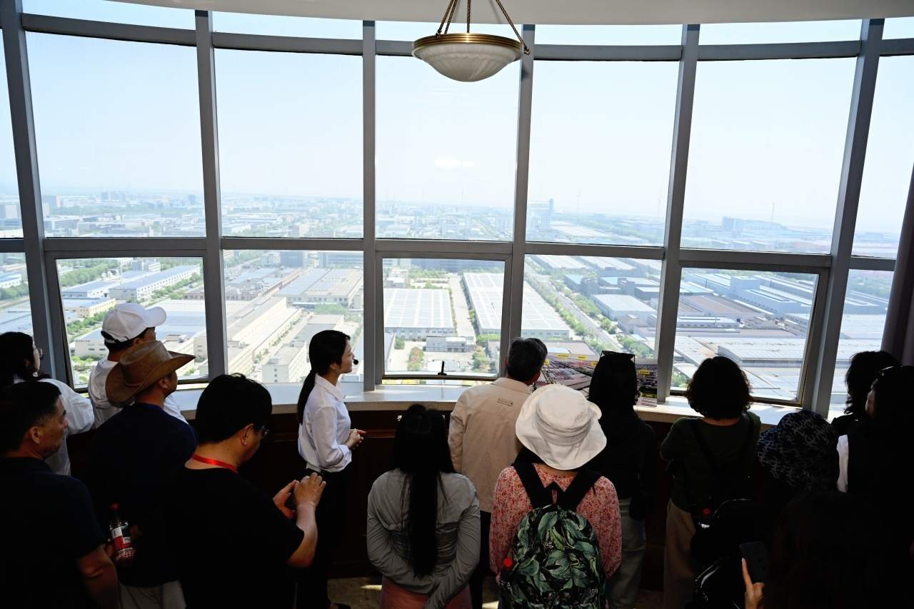 通過城市綠色觀景臺,采訪團成員們得以在空中觀景平臺俯瞰尖山全景,光伏發(fā)電板在陽光的照耀下熠熠生輝;不遠處,風力發(fā)電機的巨大葉片也在悠悠轉動。這一光伏發(fā)電與風力發(fā)電協(xié)同運作的景象被毫無保留地盡收眼底。