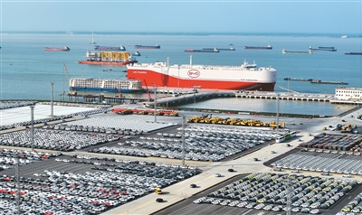 4月27日,搭載7000余輛比亞迪新能源商品車的汽車運(yùn)輸船比亞迪“深圳”號(hào)首航駛往巴西,創(chuàng)下國(guó)內(nèi)汽車單次出口量一個(gè)批次最多的紀(jì)錄。圖為運(yùn)輸船正在江蘇省蘇州港太倉(cāng)港區(qū)裝載汽車。計(jì)海新攝(人民視覺)