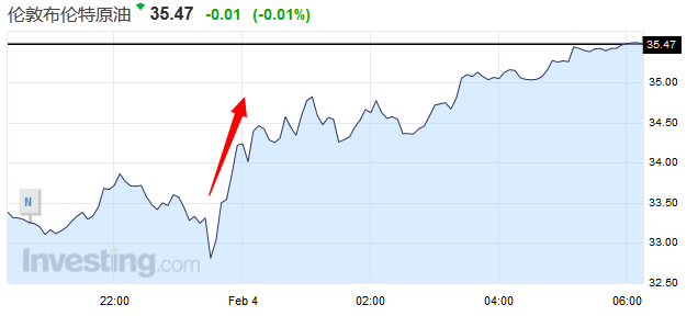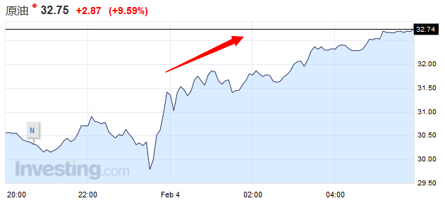 美國原油期貨結算價報每桶32.28美元,大漲2.40美元,或8%。布蘭特原油期貨結算價報每桶35.04美元,勁升2.32美元,或7.1%,盤中高見35.11美元。