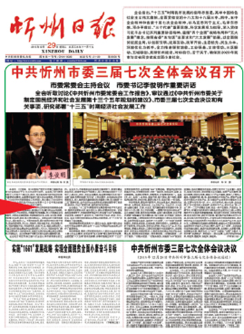 中國共產黨忻州市第三屆委員會第七次全體會議于12月28日在忻州召開。全會聽取討論了《中共忻州市委常委會工作報告》,審議通過了《中共忻州市委關于制定國民經濟和社會發(fā)展第十三個五年規(guī)劃的建議》,研究部署了“十三五”時期經濟社會發(fā)展工作。