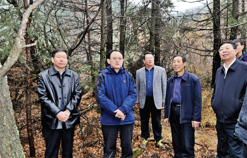 圖為市委書記李俊明在管涔山林區(qū)調(diào)研華北落葉松保護情況。(劉紀森 攝)