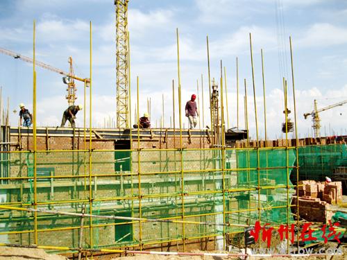 圖為8月12日民工們正在緊張施工的場面。賈金理 攝