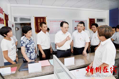 圖為省人大常委會(huì)副主任、市委書(shū)記李俊明在忻府區(qū)新建路辦事處和諧居委會(huì)調(diào)研創(chuàng)建全國(guó)文明城市情況。