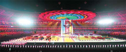 8月8日,第二屆全國青年運動會開幕式在山西省太原市山西體育中心紅燈籠體育場舉行。圖為演員在開幕式上表演。