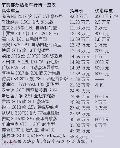 有經(jīng)銷商表示,由于今年春節(jié)來得比較早,目前大部分汽車品牌還沒有接到新一年的市場促銷政策,因此市場上還沒有出現(xiàn)大力降價促銷的情況,基本保持原有優(yōu)惠幅度。記者留意到,節(jié)前最后半個月,也有部分車型有較大的讓利幅度,但多為在廣州本地銷量較為一般的高端車或豪華車,如凱迪拉克、英菲尼迪等部分車型,優(yōu)惠基本超過6萬元以上;進(jìn)口大眾途銳的優(yōu)惠高達(dá)10萬元以上;樓蘭也有高達(dá)7萬元優(yōu)惠。而熱銷車型,如卡羅拉,近期只有6000~8000元優(yōu)惠,比此前的1.2萬~1.6萬元優(yōu)惠縮水不少;朗逸近期也只有8000~1萬元讓利,比此前也縮水近一半。經(jīng)銷商建議,如果不急著節(jié)前買車,等到節(jié)后看看也不遲。