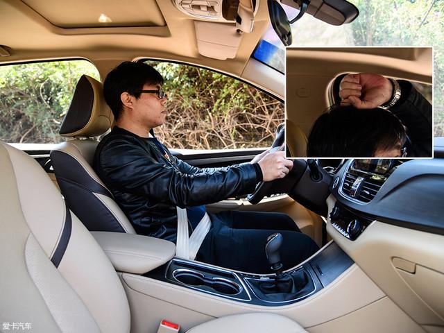 身高為172cm的體驗者坐入駕駛席,將座椅高度調(diào)至最低,頭部空間剩余一拳多。