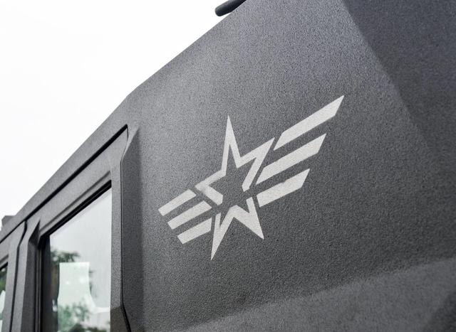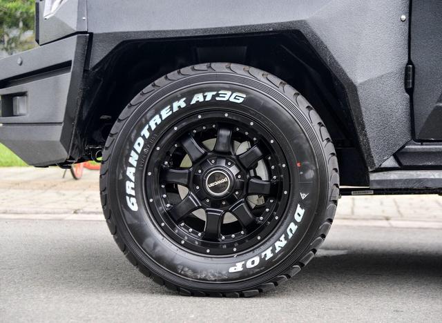 車身表面使用了亞光色涂裝,披上厚重的鋼板并經(jīng)過高溫噴砂處理,車窗采用了高強(qiáng)度復(fù)合玻璃,厚度比起一臺iPhone7還要厚。幾乎全車做過了防彈處理和碳纖維處理,側(cè)面還取消了C柱和D柱,換裝了具有一定防爆能力的輪胎,據(jù)說輪胎支持在全部破損的情況下勻速行駛。