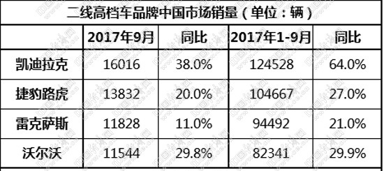相比上月,9月的二線高檔車市似乎漲勢更甚。凱迪拉克、捷豹路虎、雷克薩斯、沃爾沃四家品牌9月銷量均超萬輛,9月及前9月同比漲幅均超2位數。整體漲勢之下,二線高檔車市的排名趨勢愈發(fā)穩(wěn)定、清晰。然而,伴隨“神鋼”造假事件的不斷發(fā)酵,也為這一市場增添一大變數。