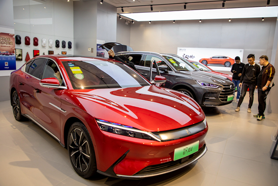 統(tǒng)計(jì)數(shù)據(jù)顯示,2021年新能源汽車(chē)產(chǎn)銷(xiāo)分別達(dá)到354.5萬(wàn)輛和352.1萬(wàn)輛,同比增長(zhǎng)均為1.6倍。此外,新能源汽車(chē)市場(chǎng)占有率提升至13.4%,進(jìn)一步說(shuō)明新能源汽車(chē)市場(chǎng)已從政策驅(qū)動(dòng)轉(zhuǎn)向市場(chǎng)拉動(dòng)。在終端消費(fèi)日漸活躍的同時(shí),越來(lái)越多的自主品牌憑借新能源汽車(chē)闖出了一條“銷(xiāo)量上升、品牌向上”的新路子。圖為消費(fèi)者在上海一家比亞迪店內(nèi)體驗(yàn)新車(chē)。視覺(jué)中國(guó)供圖