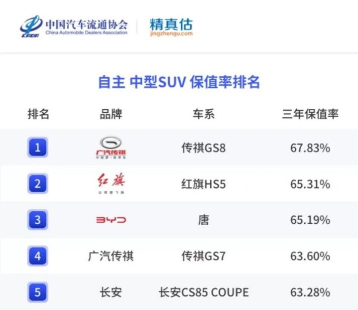 除了消費者用終端銷量為這款車投票以外,在中國汽車流通協(xié)會發(fā)布的《中國汽車品牌保值率報告》中,廣汽傳祺GS8成為了2021和2022年度的自主中型SUV保值率第一的車型,而在2023年1月和3月的報告當中,GS8的保值率也穩(wěn)居第一,這相當于二手車行業(yè)也肯定了這款車的價值。