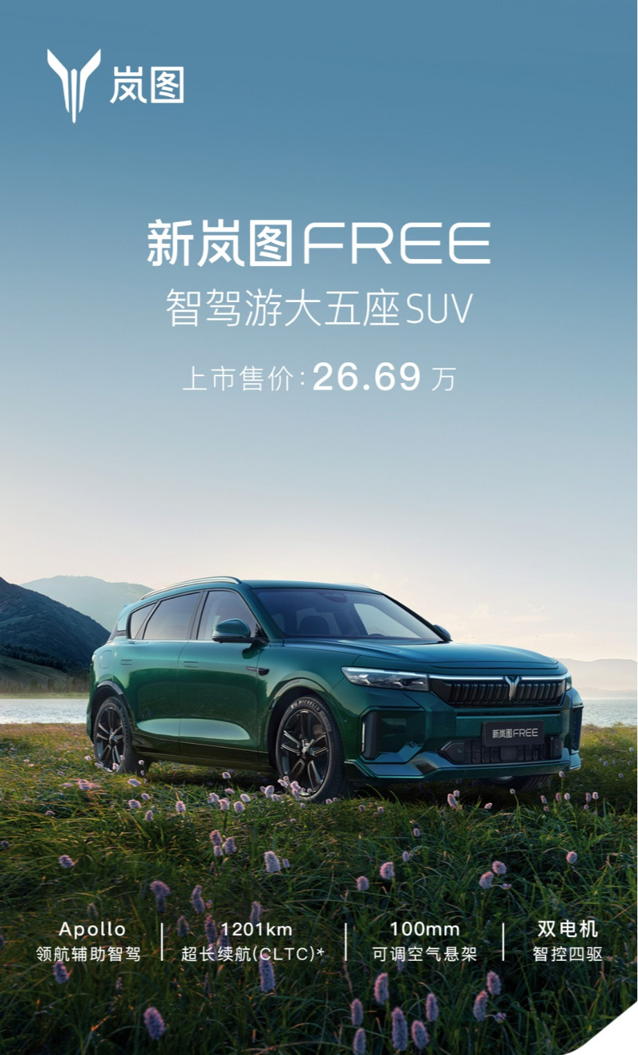 8月19日,新嵐圖FREE在2023 VOYAH NIGHT嵐圖用戶之夜正式上市,售價26.69萬元。新嵐圖FREE采用新外觀、新內(nèi)飾、新動總、新智駕,定位“智駕游大五座SUV”,首搭百度Apollo Highway Driving Pro領(lǐng)航輔助智駕;全系標配四驅(qū)系統(tǒng)和空氣懸掛;采用1.5T深度米勒循環(huán)增程器,CLTC綜合續(xù)航里程達到1201km,純電續(xù)航里程210km,是嵐圖FREE車型自上市以來的首次全面煥新升級。