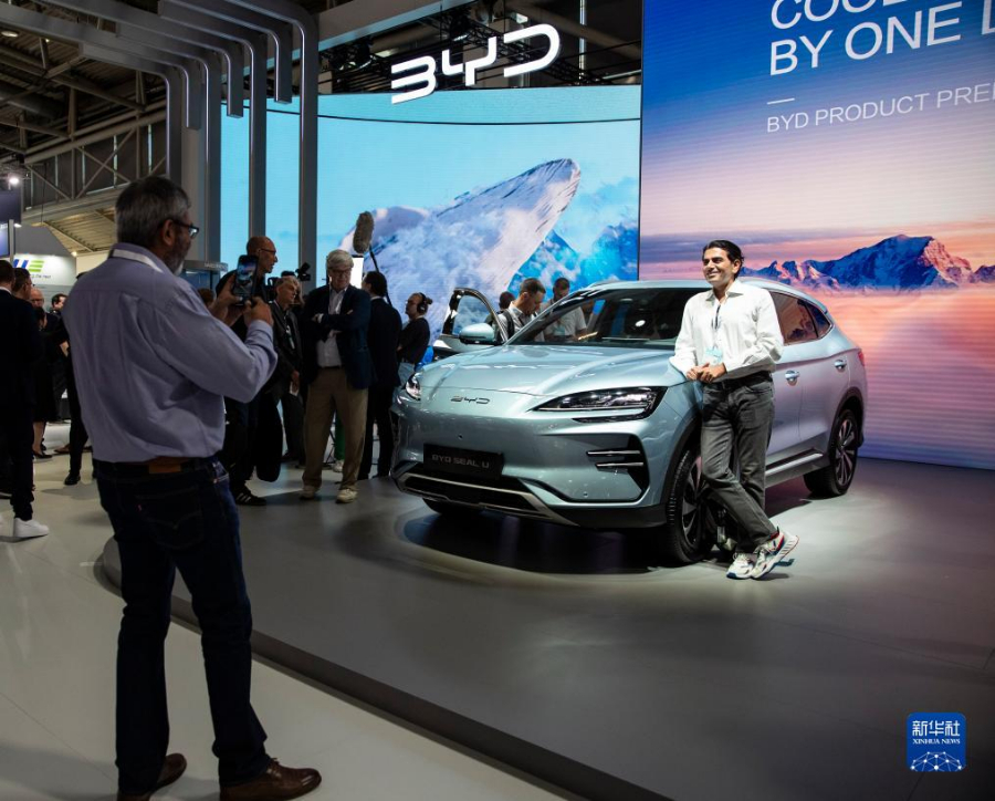 9月4日,在德國慕尼黑國際車展媒體預展上,參觀者在比亞迪品牌發(fā)布會現(xiàn)場與BYD SEAL U汽車合影。