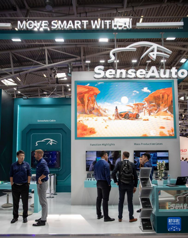 這是9月4日在德國慕尼黑國際車展媒體預展上拍攝的商湯科技展臺。