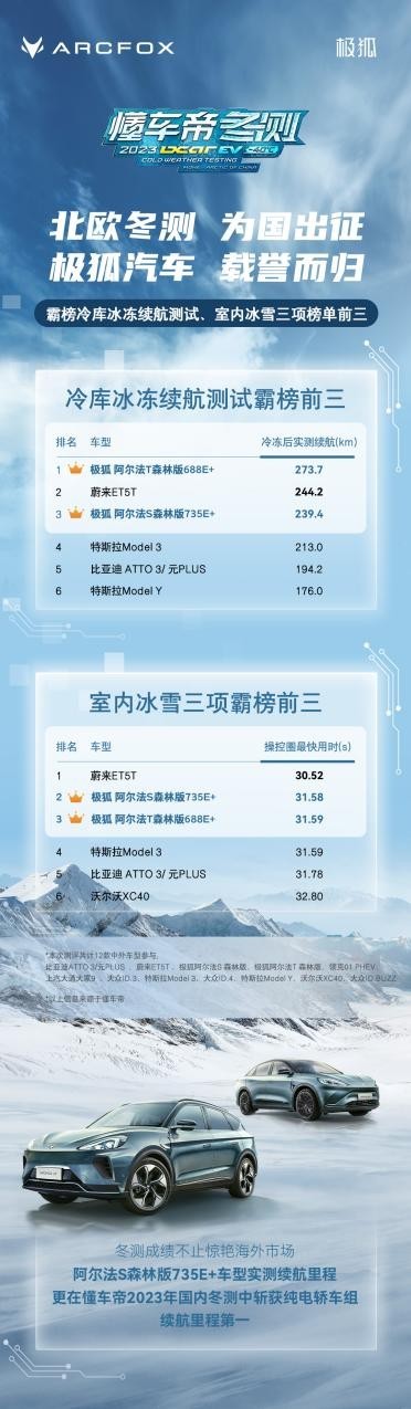 值得一提的是,就在剛剛結(jié)束的2023懂車帝冬測中,極狐汽車憑借優(yōu)異的表現(xiàn)驚艷國內(nèi)及海外市場。其中,參賽車型阿爾法S森林版735E+,以368.8的實測續(xù)航里程在國內(nèi)冬測中取得純電轎車組續(xù)航里程第一名的好成績。而阿爾法T森林版688E+、阿爾法S森林版735E+在北歐冬測中,更是以驚人的表現(xiàn),實力霸榜冷庫冰凍續(xù)航測試、室內(nèi)冰雪三項榜單前三,向世界展現(xiàn)了中國新能源汽車的卓越品質(zhì)。