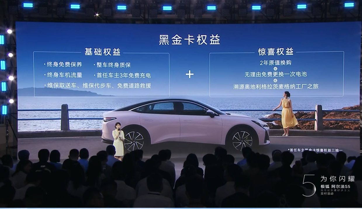 阿爾法S5交付的同時(shí),“三巨頭”還為首批用戶帶來(lái)價(jià)值不菲的黑金卡權(quán)益,包括終身免費(fèi)保養(yǎng)、首任車(chē)主3年免費(fèi)充電、免費(fèi)道路救援,以及2年原值換購(gòu)、無(wú)理由免費(fèi)更換一次電池、溯源奧地利格拉茨麥格納工廠之旅等實(shí)打?qū)嵉暮枚Y,并且此后還將定期抽取幸運(yùn)用戶持續(xù)發(fā)放黑金卡權(quán)益,開(kāi)創(chuàng)汽車(chē)行業(yè)交付價(jià)值感的新境界。