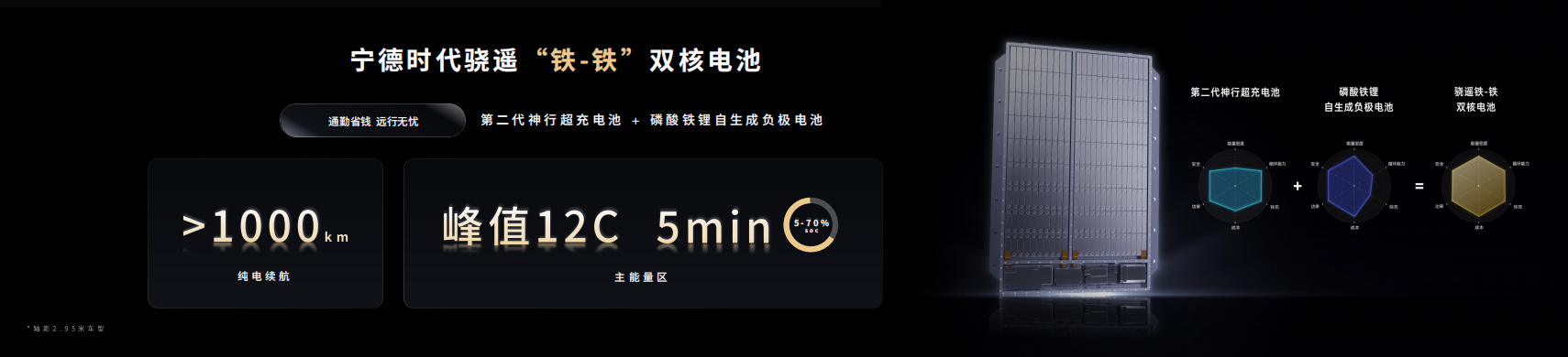 三元鐵/雙三元雙核電池:三元電池+磷酸鐵鋰自生成負極電池,主能量區(qū)三元電池充電倍率峰值可達12C,能提供超1兆瓦的強勁動力,當電量低至20%時仍可輸出超600KW的功率;由三元電池+三元自生成負極電池搭配的升級版產(chǎn)品——驍遙“雙三元”雙核電池,在軸距3米的轎車上配電量可突破180度,純電續(xù)航里程突破1500公里。