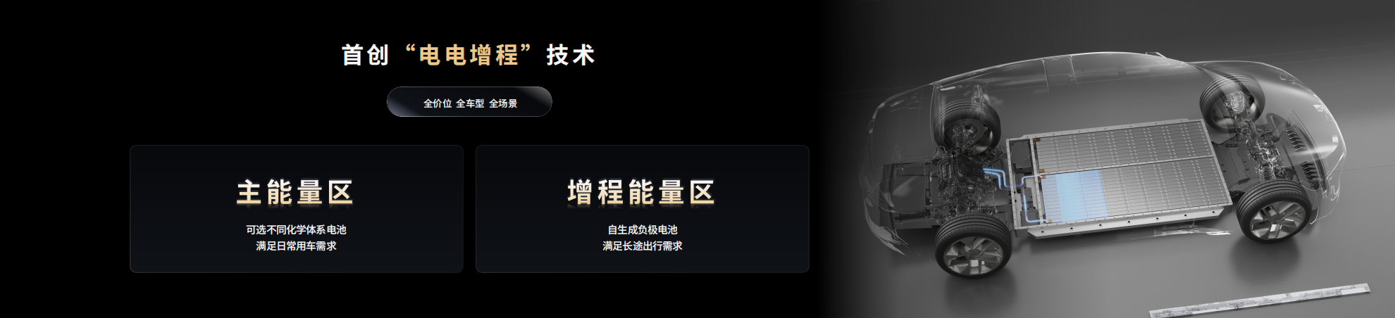 驍遙雙核電池首創(chuàng)的“電電增程”技術(shù),能夠結(jié)合車輛的行駛狀態(tài)和用戶駕駛習慣,智能調(diào)控兩個能量區(qū)的分配策略。主能量區(qū)可以根據(jù)用戶的駕駛習慣與場景,適配不同化學(xué)體系的電芯,滿足日常用車需求;增程能量區(qū)可采用高比能自生成負極技術(shù),提供更大的電量,以滿足用戶的長途出行需求。