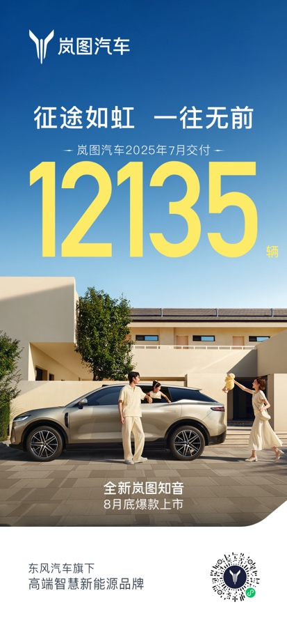 嵐圖汽車CEO盧放表示:“在用戶的支持下,嵐圖汽車7月延續(xù)高質(zhì)量發(fā)展態(tài)勢(shì),嵐圖夢(mèng)想家穩(wěn)居銷量冠軍,全新上市的嵐圖FREE+也快速獲得市場認(rèn)可,這進(jìn)一步堅(jiān)定了我們的發(fā)展信心。8月,我們將更進(jìn)一步提速生產(chǎn)交付、升級(jí)服務(wù)體驗(yàn)、加強(qiáng)用戶交流,并推出新產(chǎn)品——全新嵐圖知音,為用戶帶來更多優(yōu)質(zhì)選擇,為品牌發(fā)展注入更強(qiáng)動(dòng)能。”