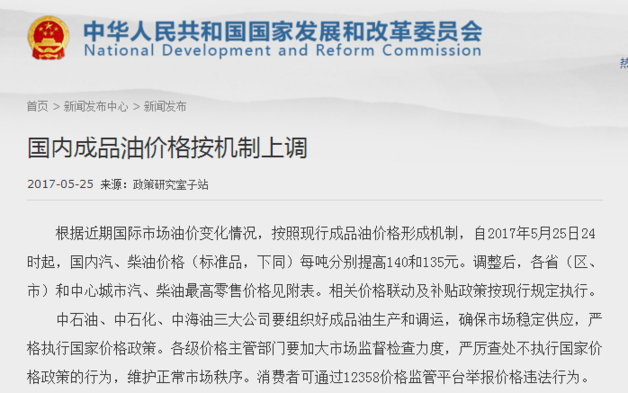 昨日(25日),國家發(fā)展和改革委員會(huì)發(fā)布消息稱,根據(jù)近期國際市場油價(jià)變化情況,按照現(xiàn)行成品油價(jià)格形成機(jī)制,自2017年5月25日24時(shí)起,國內(nèi)汽、柴油價(jià)格(標(biāo)準(zhǔn)品,下同)每噸分別提高140和135元。相關(guān)價(jià)格聯(lián)動(dòng)及補(bǔ)貼政策按現(xiàn)行規(guī)定執(zhí)行。