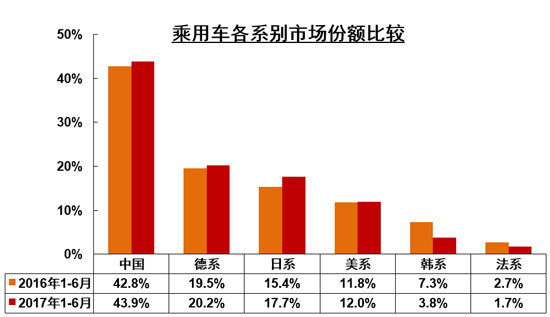 上半年,德系、日系、美系、韓系和法系乘用車分別銷售227.52萬輛、198.92萬輛、135.17萬輛、43.09萬輛和18.84萬輛,分別占乘用車銷售總量的20.22%、17.68%、12.01%、3.83%和1.67%。與上年同期相比,日系乘用車銷量保持較快增長,德系和美系增速略低,韓系和法系降幅依然明顯。陳士華表示,韓系車銷量下滑多少是受了政治因素的影響,然而最主要的原因還是產(chǎn)品競爭力低,新產(chǎn)品投放速度慢以及產(chǎn)品質(zhì)量差等問題。
