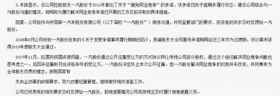 2011年6月,一汽股份成立之初,曾向一汽轎車和一汽夏利作出不可撤銷承諾:在一汽股份成立后五年內(nèi)通過(guò)資產(chǎn)重組或其他方式整合所屬的轎車整車生產(chǎn)業(yè)務(wù),以解決同業(yè)競(jìng)爭(zhēng)問(wèn)題。但五年過(guò)去了,這一問(wèn)題并未得到解決,在2016年6月28日,一汽轎車和一汽夏利同時(shí)發(fā)布公告稱,一汽股份原計(jì)劃在五年內(nèi)解決其與子公司一汽轎車、一汽夏利同業(yè)競(jìng)爭(zhēng)的承諾無(wú)法履行,將承諾期再度延遲三年作為過(guò)渡期,而上述承諾的截止日期,也就是2019年6月28日。