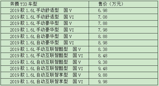 動力方面,奔騰T33搭載1.6升自然吸氣發(fā)動機(jī)最大功率為114馬力/5500rpm,峰值扭矩為155牛米/3600rpm,匹配愛信6AT變速箱。