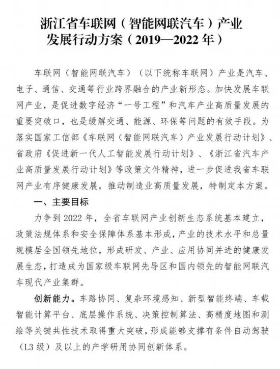 推動智能網(wǎng)聯(lián)發(fā)展的,除了技術(shù),還有政策?!凹涌彀l(fā)展智能網(wǎng)聯(lián)產(chǎn)業(yè),是促進(jìn)數(shù)字經(jīng)濟(jì)‘一號工程’和汽車產(chǎn)業(yè)高質(zhì)量發(fā)展的重要突破口,也是緩解交通、能源、環(huán)保等問題的有效手段。”近日,浙江省經(jīng)濟(jì)和信息化廳、科技廳、交通運輸廳聯(lián)合印發(fā)《浙江省車聯(lián)網(wǎng)(智能網(wǎng)聯(lián)汽車)產(chǎn)業(yè)發(fā)展行動方案(2019-2022 年)》(以下簡稱《方案》)中所指出的,正是發(fā)展智能網(wǎng)聯(lián)的意義所在。