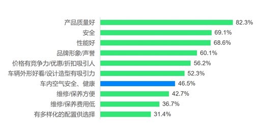 消費(fèi)者前三大購(gòu)車考慮因素是質(zhì)量(82.3%)、安全(69.1%)和性能(68.6%),但疫情使車內(nèi)空氣安全和健康上升成為購(gòu)車時(shí)的又一考量重點(diǎn)(46.5%)。