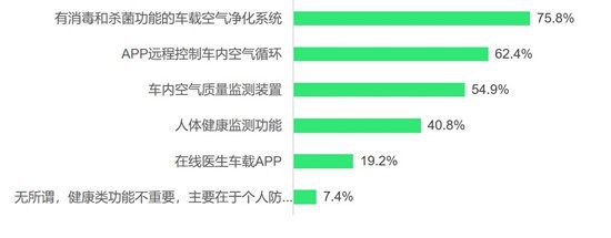 有消毒和殺菌功能的車載空氣凈化系統(tǒng)(71.9%)、APP遠(yuǎn)程控制車內(nèi)空氣循環(huán)(65.6%)和車內(nèi)空氣質(zhì)量監(jiān)測(cè)裝置(61.3%)是意向購(gòu)車者最關(guān)注的健康類功能和配置。