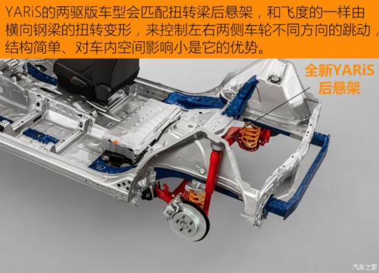對于這些尺寸小巧的車型來說,提高車內的空間利用率非常的重要,日本工程師往往非常擅長這一點。在全新YARiS(兩驅版)和飛度都選擇了前麥弗遜+后扭轉梁的懸架結構,這是綜合性能和空間因素后最合理的設計方案。