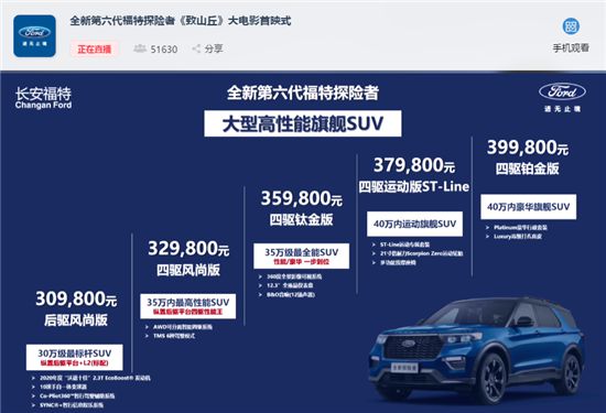 作為長安福特“大型高端旗艦SUV”,全新第六代福特探險者共推出5款車型,售價區(qū)間為30.98萬-39.98萬元,全系支持6座或7座布局選擇。