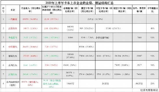 8月底,A股與H股共28家上市整車企業(yè)陸續(xù)發(fā)布了2020年半年度報告。經(jīng)濟(jì)觀察報記者通過統(tǒng)計對比發(fā)現(xiàn),乘用車企業(yè)與商用車企業(yè)的半年度業(yè)績呈現(xiàn)“冰火兩重天”的態(tài)勢:絕大多數(shù)乘用車整車企業(yè)出現(xiàn)營業(yè)收入、歸屬于上市公司股東凈利潤雙下滑,而幾家主營卡車業(yè)務(wù)的整車企業(yè)卻迎來高光時刻,實(shí)現(xiàn)增收又增利。 記者重點(diǎn)統(tǒng)計了一汽解放、江鈴汽車、華菱星馬、中國重汽、福田汽車、東風(fēng)汽車、江淮汽車、東風(fēng)集團(tuán)股份這8家以商用卡車業(yè)務(wù)為重點(diǎn)的整車企業(yè)。在這8家車企中,有6家企業(yè)的卡車銷量占比超過60%,有的則高達(dá)90%。 需要說明的是,東風(fēng)集團(tuán)股份是一家以乘用車為主業(yè)的公司,其卡車銷量占總銷量的比例只有23%,但由于卡車銷售收入占到了總銷售收入的40%,因此也計入本次統(tǒng)計中。另有一些整車企業(yè)雖然也發(fā)展卡車業(yè)務(wù),但由于銷量占比較小,如上汽依維柯紅巖的銷量只占上汽集團(tuán)總銷量的2%,對上市公司業(yè)績的影響也較為有限,因此不納入統(tǒng)計范圍。