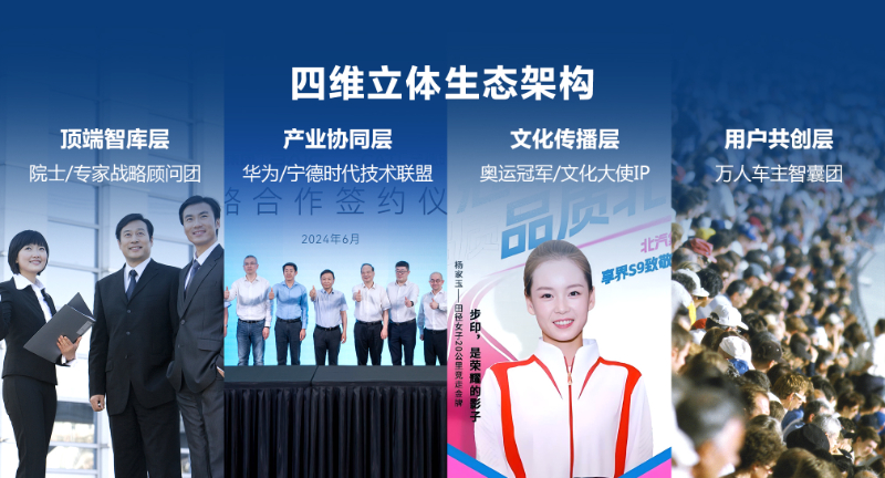 “品牌摯友計(jì)劃”是北汽集團(tuán)“品牌三年躍升行動(dòng)”的重要引擎,構(gòu)建一個(gè)“四維立體生態(tài)”:頂端智庫(kù)層,邀請(qǐng)?jiān)菏?、?zhuān)家、經(jīng)濟(jì)學(xué)家組成戰(zhàn)略顧問(wèn)團(tuán);產(chǎn)業(yè)協(xié)同層,與華為、寧德時(shí)代等合作伙伴共建技術(shù)品牌聯(lián)盟;文化傳播層,攜手奧運(yùn)冠軍、文化名人打造"美好出行大使"IP;用戶(hù)共創(chuàng)層,建立萬(wàn)人級(jí)車(chē)主智囊團(tuán)。除了外部資源,品牌摯友計(jì)劃還將逐步拓展至20位內(nèi)部管理者及300名KOE員工。