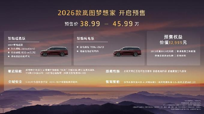 8月29日,第二十八屆成都國際汽車展覽會盛大開幕。全面煥新升級的“新時代旗艦MPV”2026款嵐圖夢想家預(yù)售亮相。本次新車共推出智能超混版和智能純電版兩個動力版本,預(yù)售價為38.99萬-45.99萬,同步推出了價值超萬元的多項重磅權(quán)益,包括2000元抵5000元尾款的膨脹金,終身免費(fèi)三電質(zhì)保、終身免費(fèi)基礎(chǔ)保養(yǎng)和優(yōu)先交付提車。9月1日起,2026款嵐圖夢想家展車、試駕車將陸續(xù)到店,消費(fèi)者可以進(jìn)店親自體驗新車的獨(dú)特魅力。