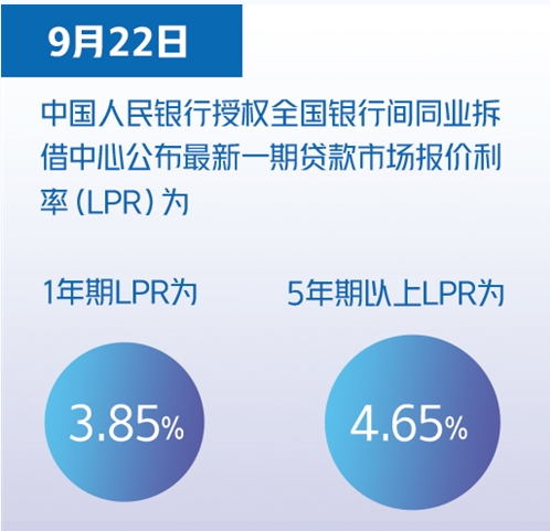 9月22日,中國人民銀行授權(quán)全國銀行間同業(yè)拆借中心公布最新一期貸款市場報價利率(LPR)為:1年期LPR為3.85%,5年期以上LPR為4.65%。兩項(xiàng)貸款市場報價利率均連續(xù)18個月保持這一水平。