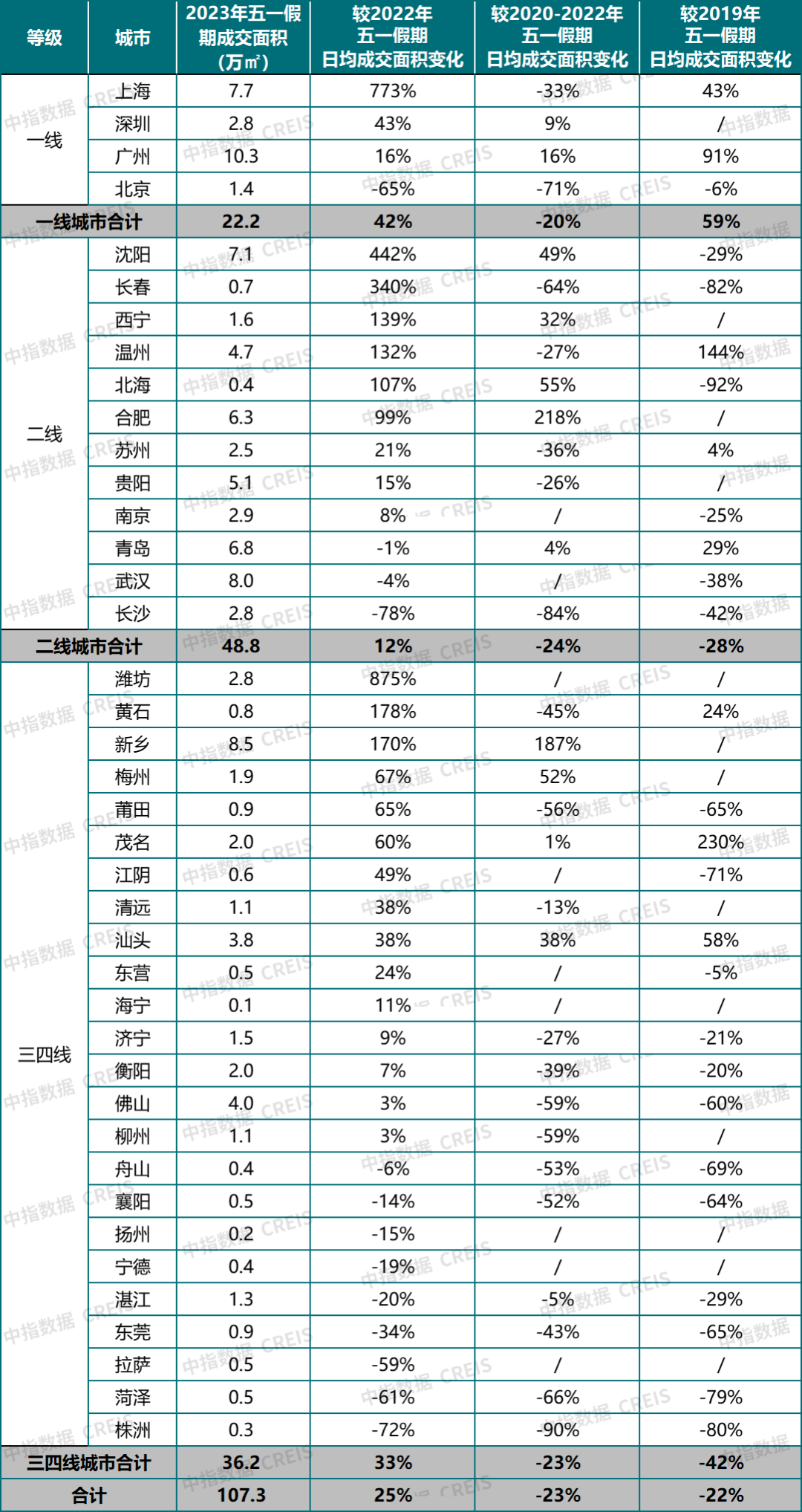 根據(jù)中指研究院數(shù)據(jù),2023年“五一”期間,代表城市成交規(guī)模較去年五一假期增長約25%,其中多個(gè)城市受低基數(shù)影響,同比增幅較大,但整體較2019年同期降幅仍超兩成。
